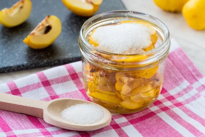 Pigwę z cukrem do herbaty przygotuj warstwowo. Pierwszą warstwę stanowi cukier, na który układamy pokrojone owoce.